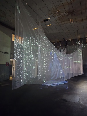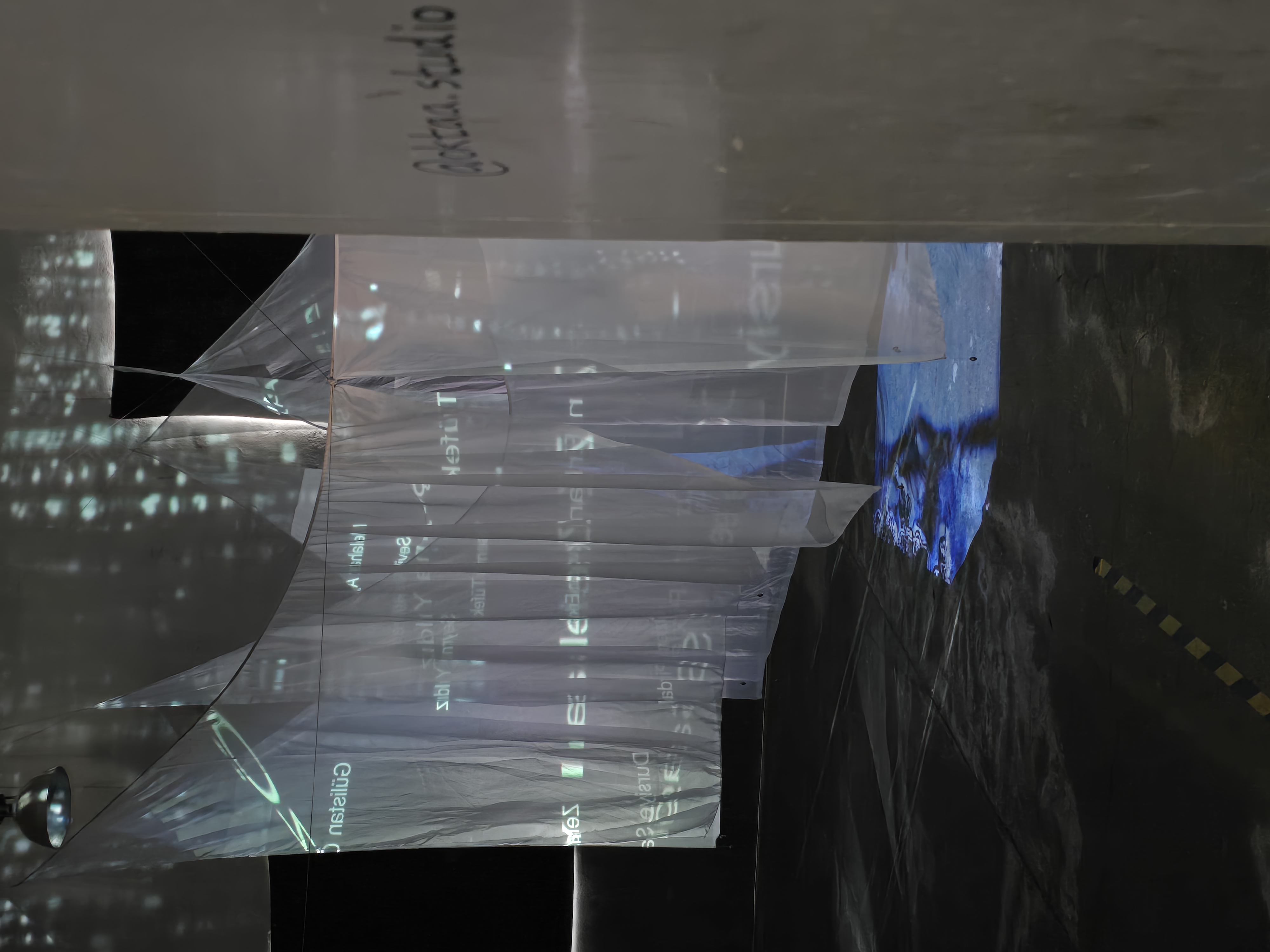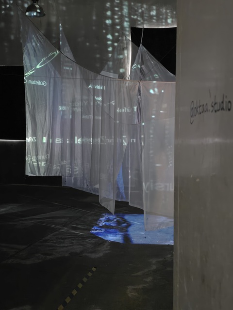 Inspired by Guy Debord’s concept of the spectacle, the installation seeks to transform the viewer from a passive observer into an active participant in mourning and remembrance. The flickering light and echoing water drops behind the curtains respond to the viewer’s bodily presence, turning the space into a living field where memory, guilt, and witnessing are not only represented but also produced.
